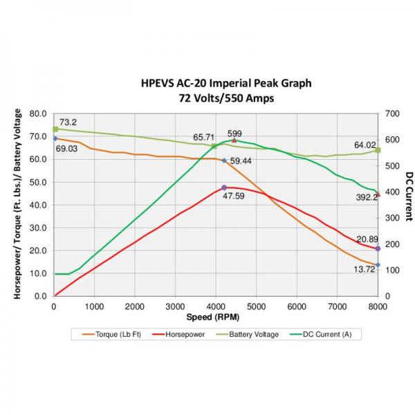 The AC-20 is an AC motor that operates at 48-80V. It can draw up to 550A producing up to 47 HP (35 kW) and 69 ft-lbs (94 Nm) of torque. This kit works very well in small, lightweight applications such as small boats, dirt bikes, ATVs, golf carts, kei cars and microcars. Features include regenerative braking as well as an idle function. At 72 volts, it makes a safer low voltage system that will give you lots of reliable EV miles.