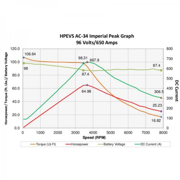 The AC-34 is an AC motor that operates at 72-128V. It can draw up to 900A producing up to 65 HP (49kW) and 106 ft-lbs (144 Nm)of torque. This kit works very well in medium sized cars and lightweight vehicles. Features include regenerative braking as well as an idle function. At a modest 108 volts it makes a safer low voltage system that will give you lots of reliable EV miles.